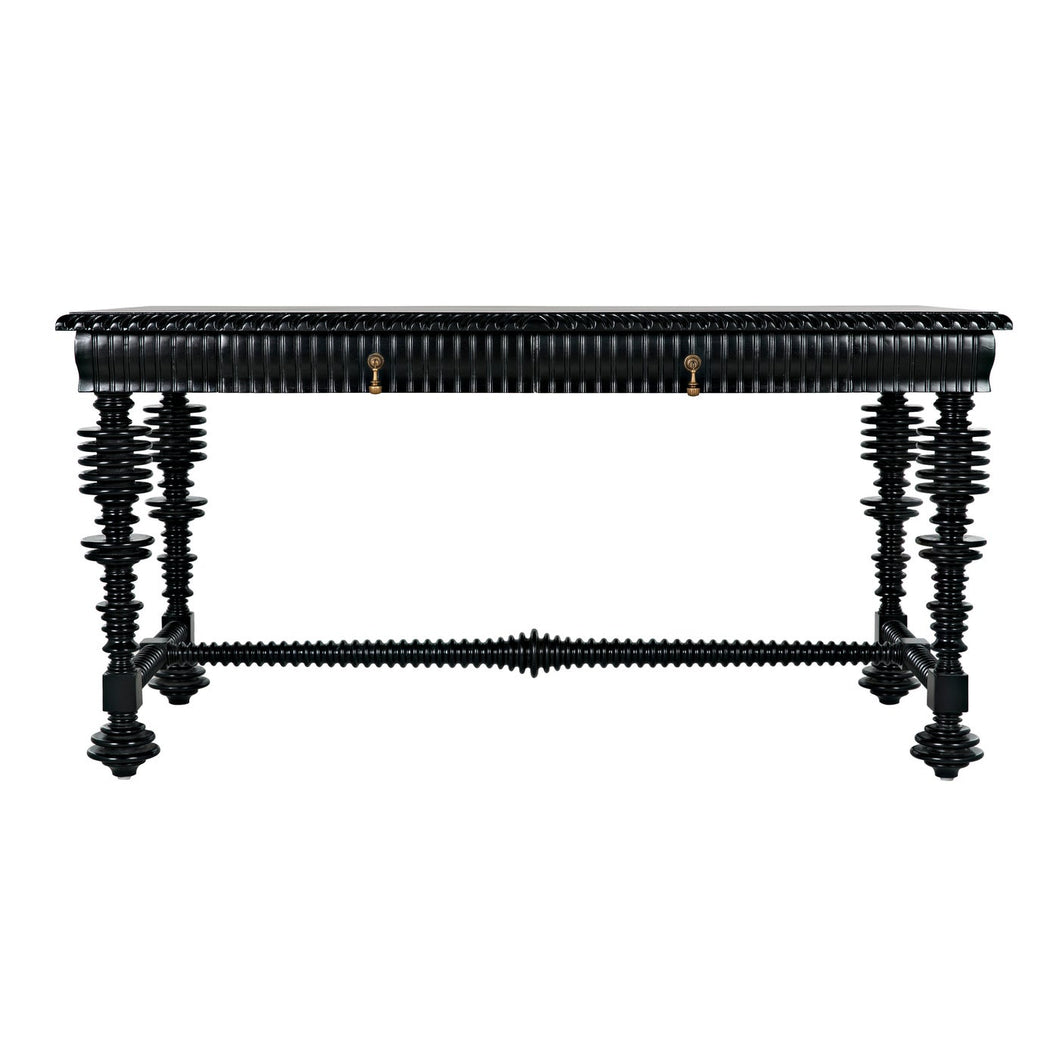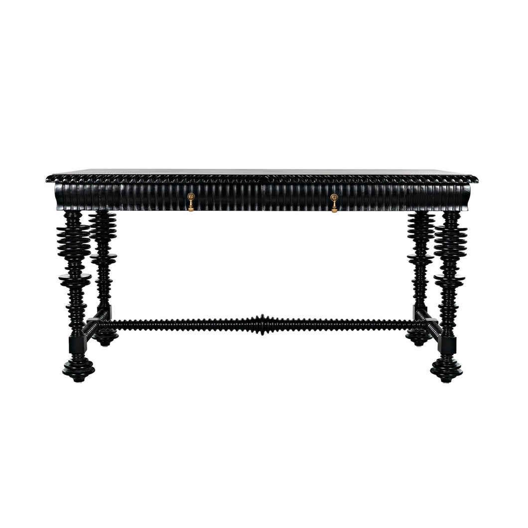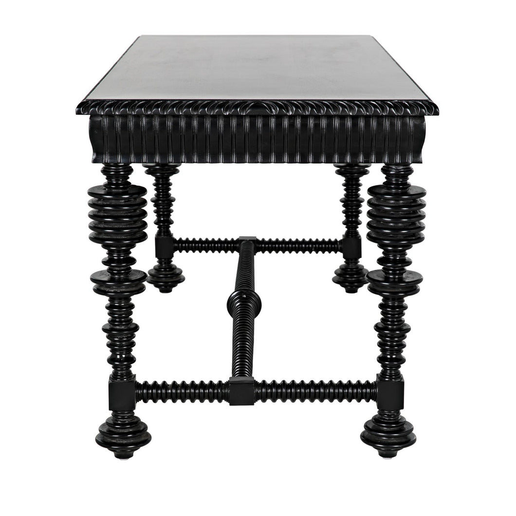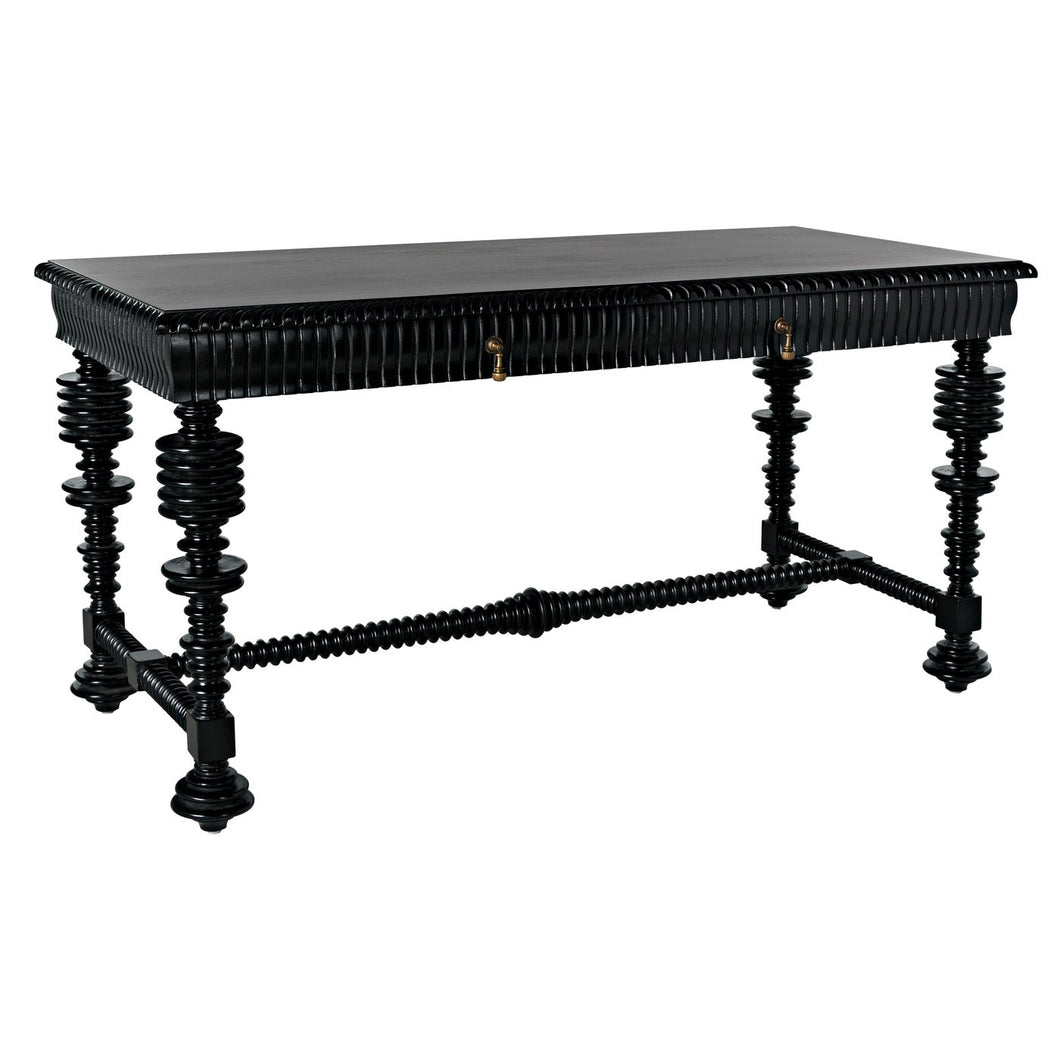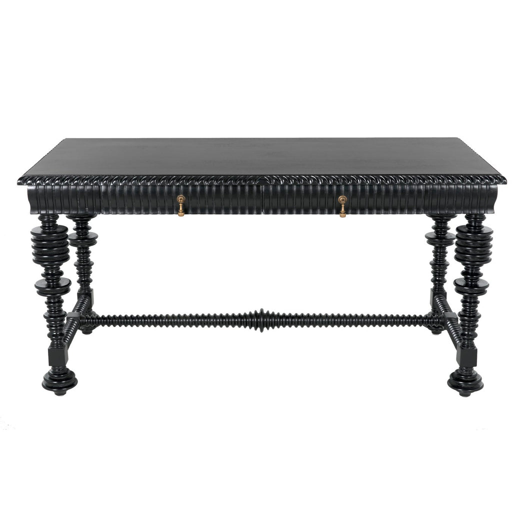 Dimensions (in): 60W x 28D x 31H Our classic "Portuguese" desk is now offered in a smaller, 60" wide version that features intricate turning, and carving on all four sides. Hand rubbed black finish is lustrous and satiny, two drawers are accented by intricate antique brass teardrop pulls.