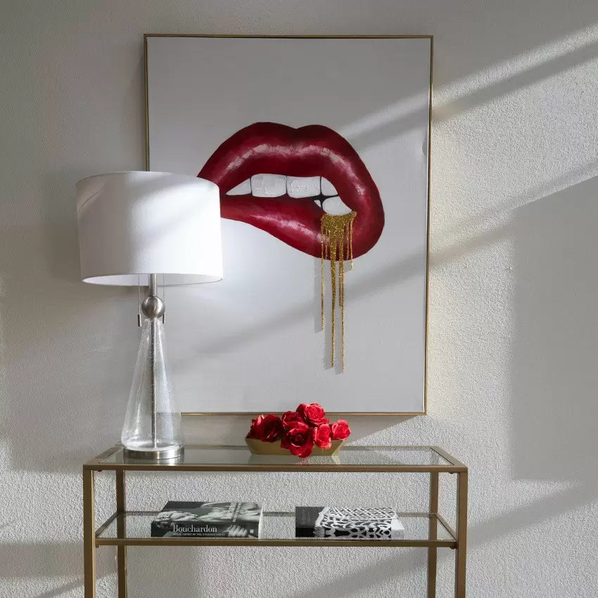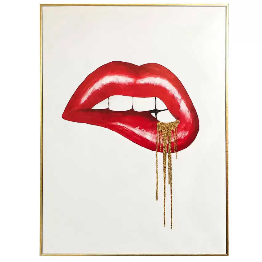 Kiss goodbye to plain, boring walls! Introducing the Dripping in Gold Wall Art, a glamorous art canvas ready to bring a pop of chic color to your room. With partial hand-painting and rhinestone applique, this lipstick wall art radiates personality. This high-quality metallic frame canvas is a work of art. Crafted with care and attention to detail, this gallery-wrapped canvas features hand-painted touches that create a bold 3D effect. The gold floating frame adds an extra touch of elegance, while the real rhinestone appliques catch the light from every angle. Made with acrylic paint on canvas and resin rhinestone accents.