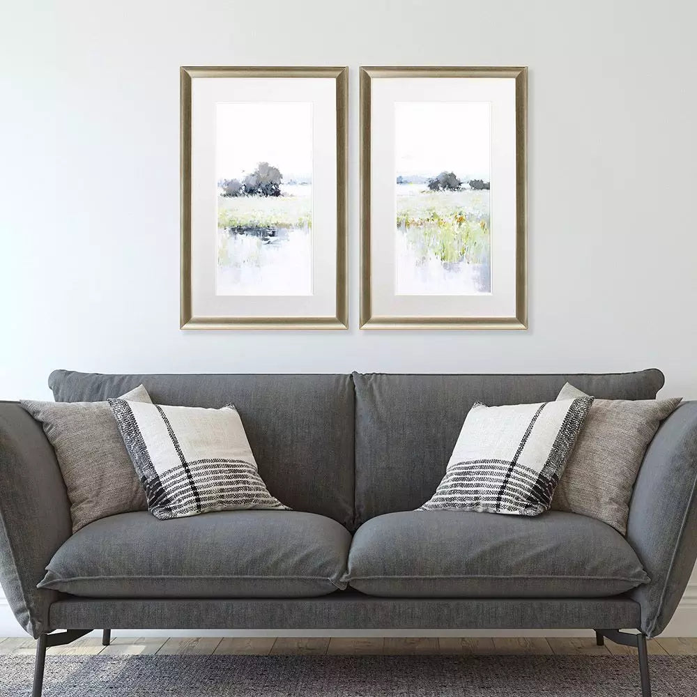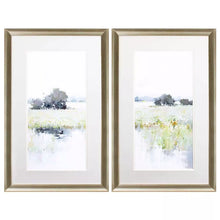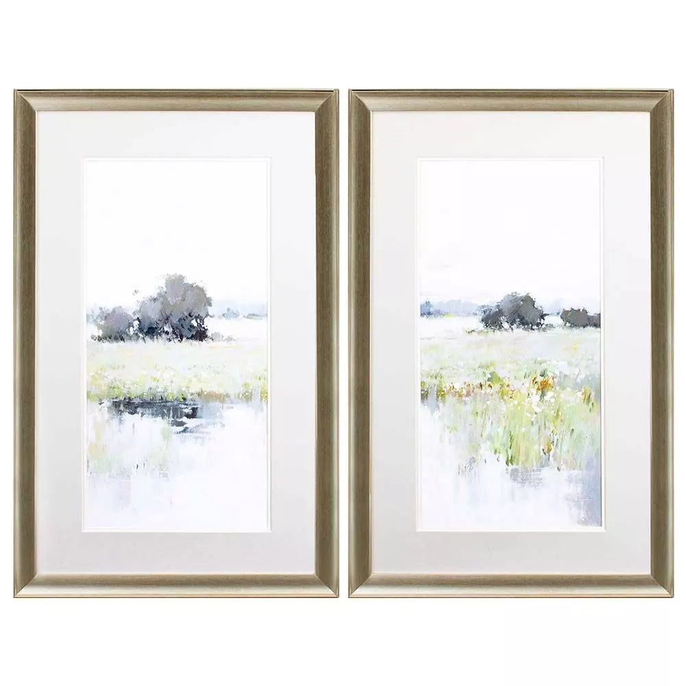 A set of two serene landscape prints that are double matted and framed under glass with a complimenting brushed silver frame.