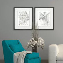 European city sketches are matted in white and framed in a distressed black finish molding with gray wash.