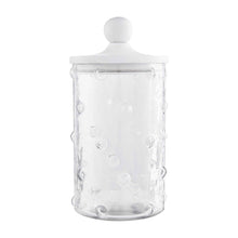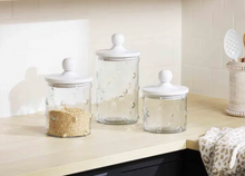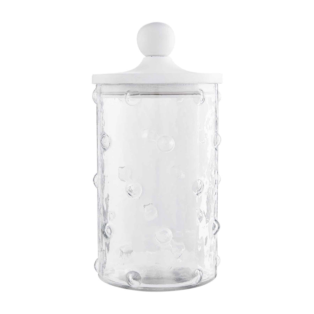 This Large Hobnail Glass Canister was meticulously created for kitchen counters. The hobnail glass canister features an enameled mango wood lid. The canister features hobnail details throughout and a white top. These canisters are great for flour, sugar, coffee beans and more!