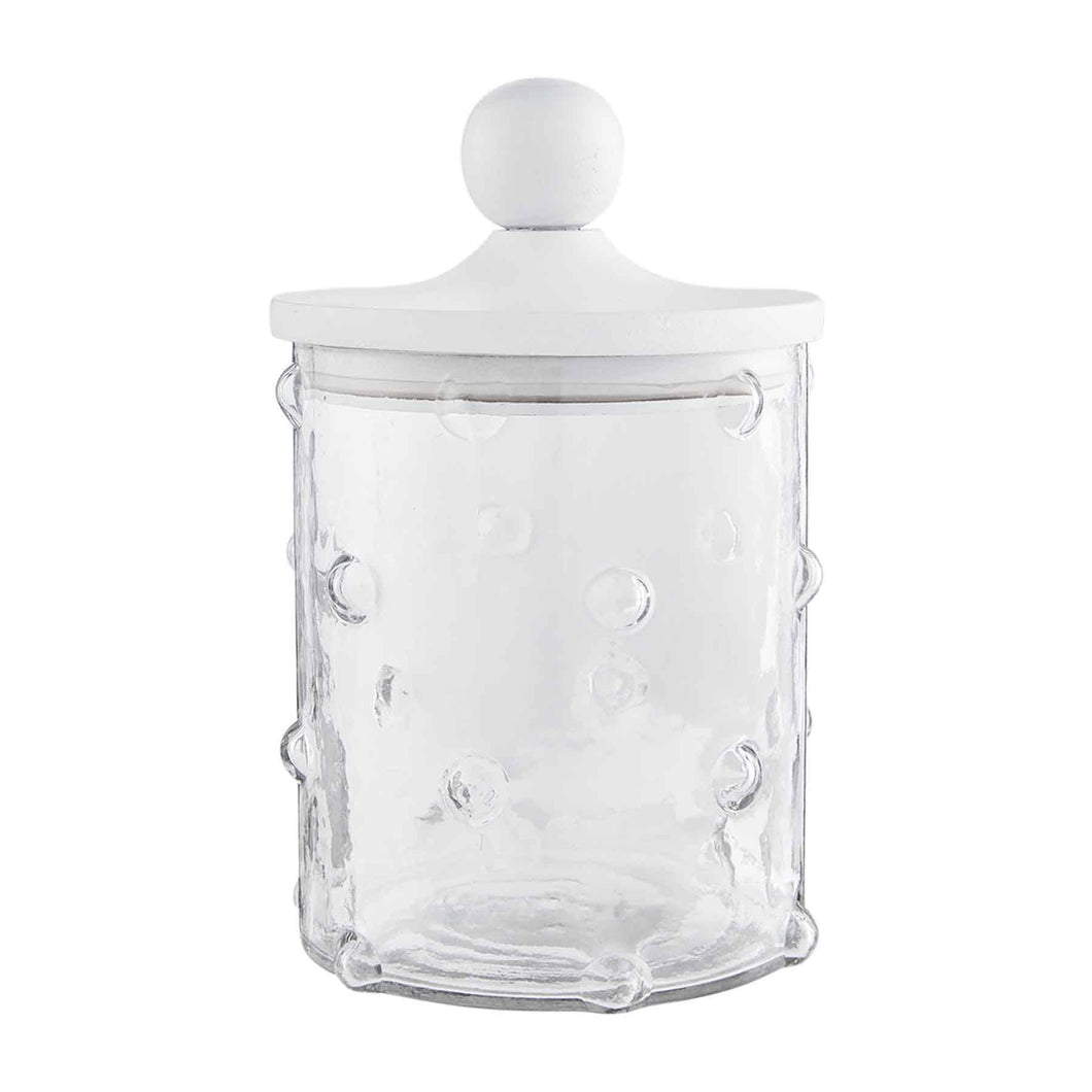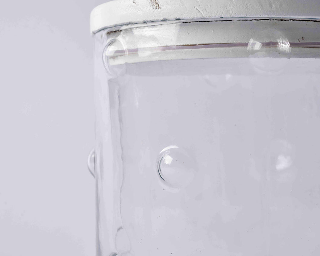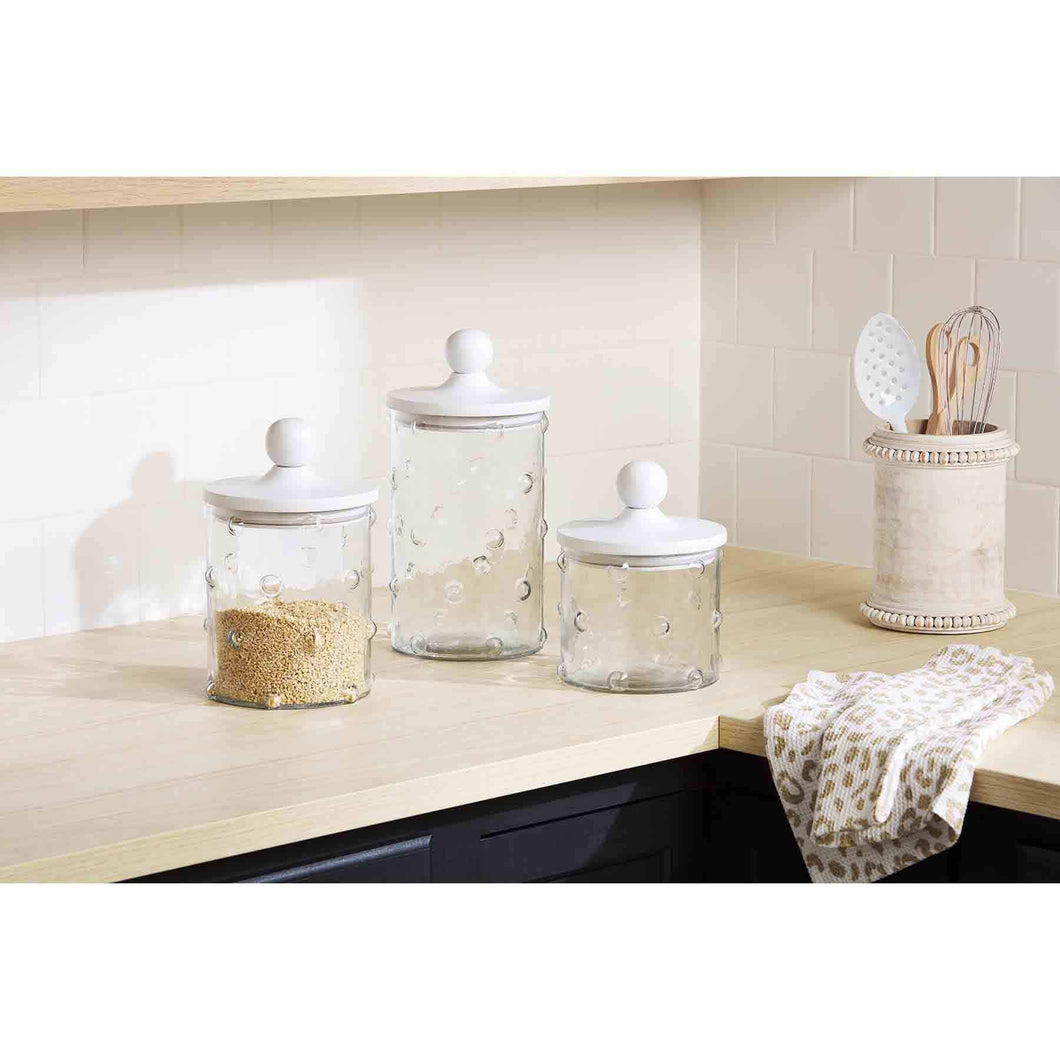 This Medium Hobnail Glass Canister was meticulously created for kitchen counters. The hobnail glass canister features an enameled mango wood lid. The canister features hobnail details throughout and a white top. These canisters are great for flour, sugar, coffee beans and more!