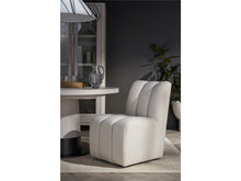 The Kylo Side Chair offers a bold reinterpretation of contemporary luxury, boasting a seat with pronounced tufting that creates a rich tapestry of deep ridges and sumptuous comfort. Clad in the sophisticated Canberra Ivory Fabric, the chair's design is accentuated by three elegantly upholstered vertical sections, each contributing to its visual allure. Mounted on sleek casters, it combines effortless mobility with a modern, refined aesthetic.