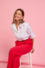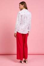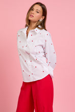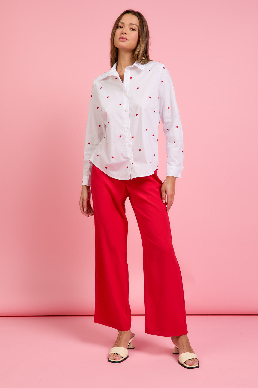Embroidered hearts accent this long-sleeve button-down shirt in crisp white poplin. Wear it to add a playful touch to your outfits.