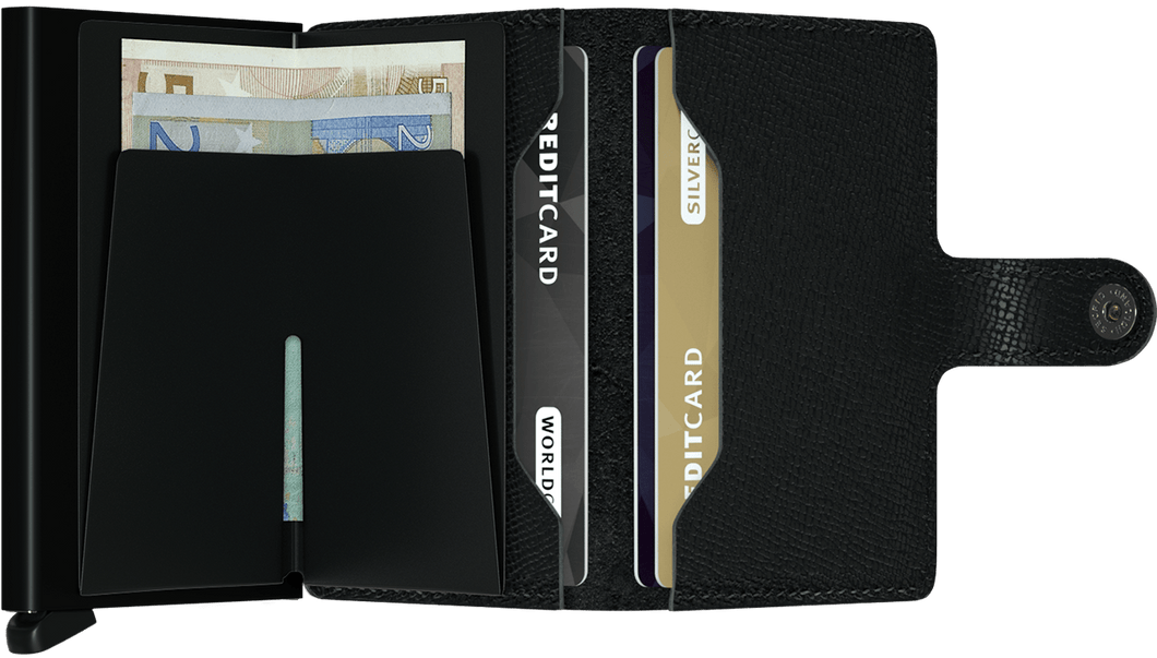 Small in size and surprisingly large in storage capacity, the Miniwallet combines the best of both worlds. The exterior holds banknotes, receipt and cards, while the aluminium Cardprotector allows you to slide out cards with one simple motion and protects them from bending, breaking and unwanted wireless communication.