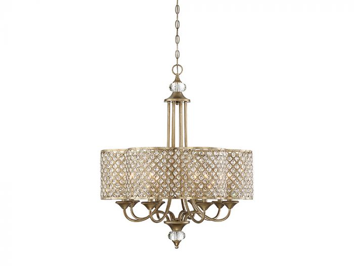 The Regis 8-light chandelier is a truly glamorous look that is perfect for those who want shimmer and shine. It modernizes chandelier design with a drum shade featuring a latticework of clear crystals and an extra faceted crystal touch at the finial. Pyrite finish.