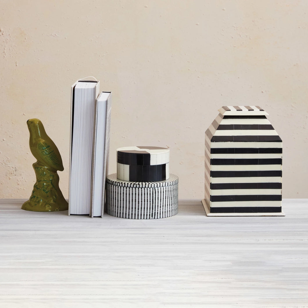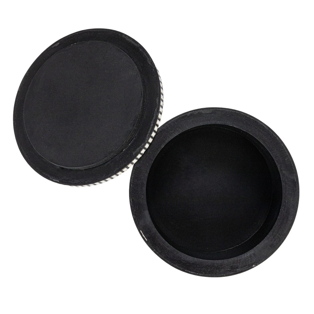 Dimensions: 6-1/4" Round x 3"H Resin & MDF Box, Black & Cream Color