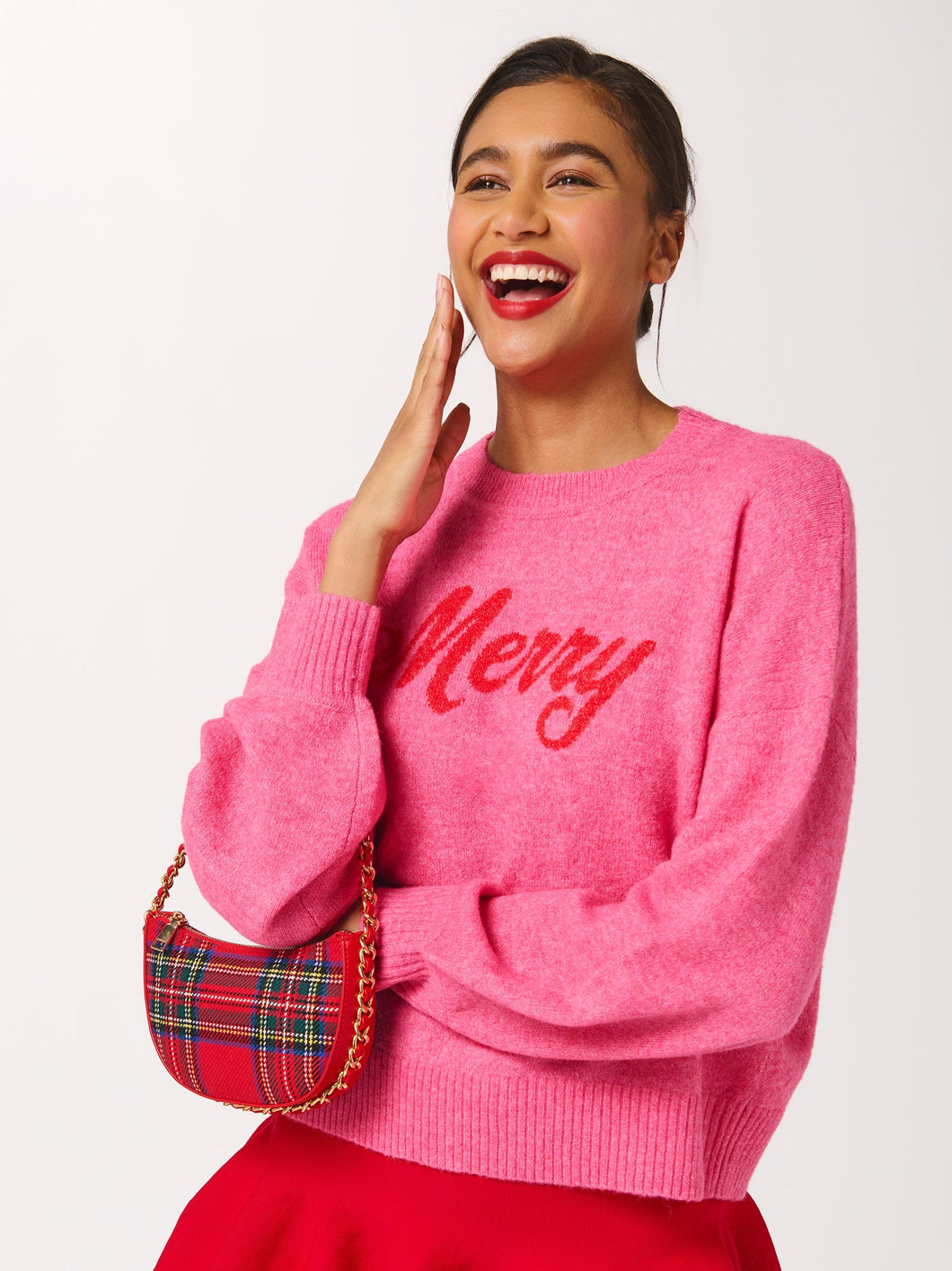 The Scottie Handheld Bag is your new holiday plus-one, dressed up in a festive plaid that’s as charming as it is chic. Featuring a single chain-wrapped handle, top zip closure, and one inner zip pocket, it’s made to hold your essentials in style. Whether you choose the bold red or classic navy colorway, this petite crescent silhouette adds instant cheer to any look. It's the perfect finishing touch for party outfits, cozy gatherings, or a gift-worthy accessory moment.