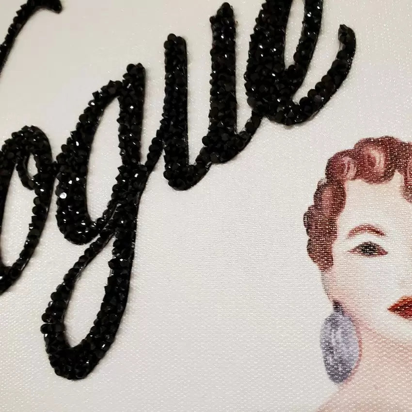 Nothing says style more than Vogue. This art piece is made to add a touch of glam to any room. Made from high quality metallic framed canvas, with partial hand painting and rhinestone appliques, you are sure to never see art like this anywhere else. Made with acrylic paint on canvas alongside resin rhinestone accents, this stunning piece is an ode to fashion as it glistens from every angle. Crafted with care and attention to detail, this gallery-wrapped canvas features hand-painted touches and rhinestone embellishments that create a 3D effect.